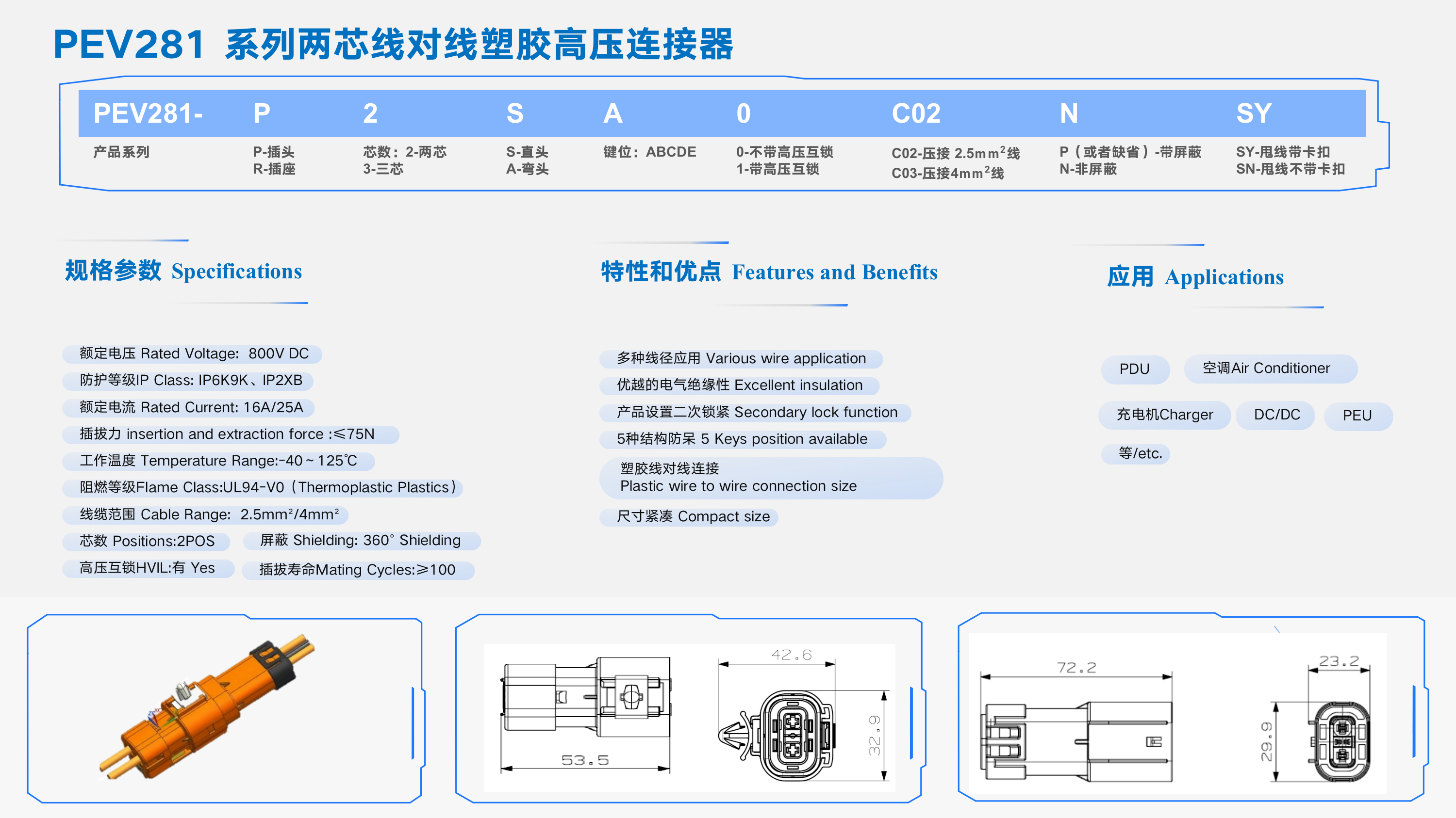 PEV281 系列兩芯線對線塑膠高壓連接器