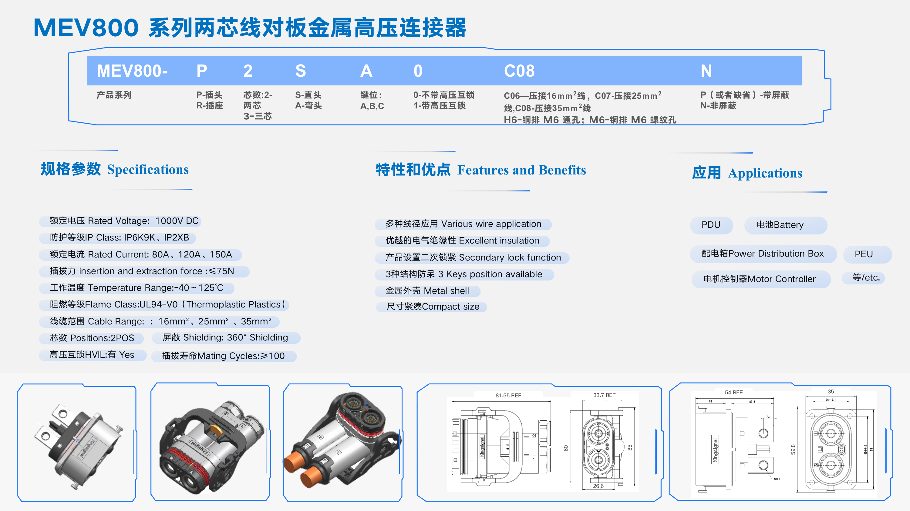 MEV800 系列兩芯線對板金屬高壓連接器