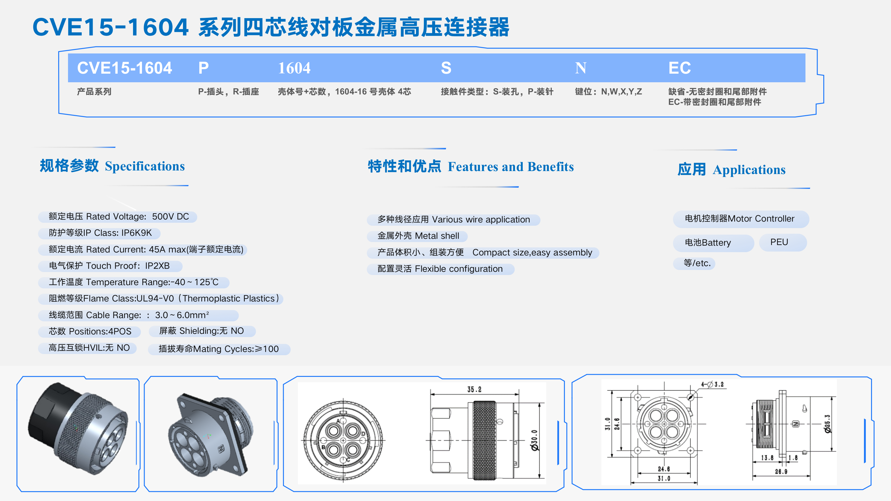 CVE15-1604 系列四芯線對板金屬高壓連接器
