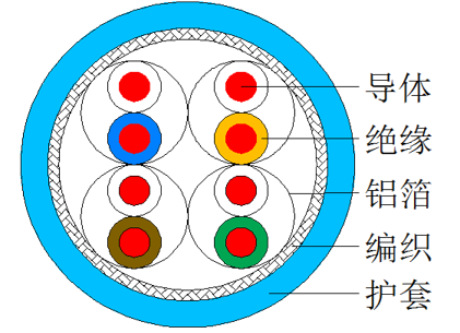 芯線對絞:橙/白、藍/白、綠/白、棕/白,每對鋁箔麥拉屏蔽