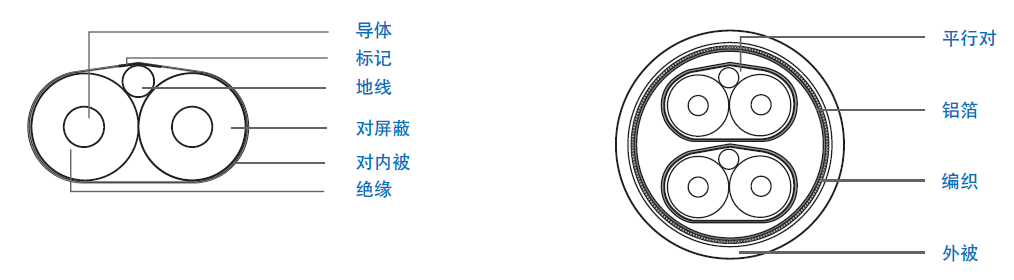 | 導(dǎo)體:28 AWG 單根鍍銀銅線(xiàn), 外徑0.35 mm | 半成品:2 對(duì) (#1-2) 一起成纜 |