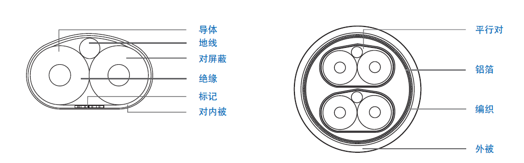 | 地線:28 AWG 單極鍍錫銅線, 外徑0.33 mm | 外屏蔽:38 AWG 鍍錫導體,重疊率 65% |